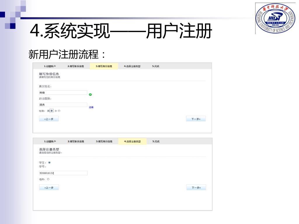 4.系统实现——用户注册 • 设计思路: • 1.注册链接与登录和忘记密码两项统一风格列在其正下方 • 2.将Email和手机号设置为必填项,使得管理员可以通过Email或者手机通知用户是否审核通过 • 3.增加详细信息如性别和政治面貌 • 4.注册类型选教授后弹出选项选择职位:教授,副教授,讲师 • 注册类型选学生后弹出框表填写学号 • 5.所有信息直接传给数据库的user表,根据选择的注册类型对应到studentinfo或者teacherinfo