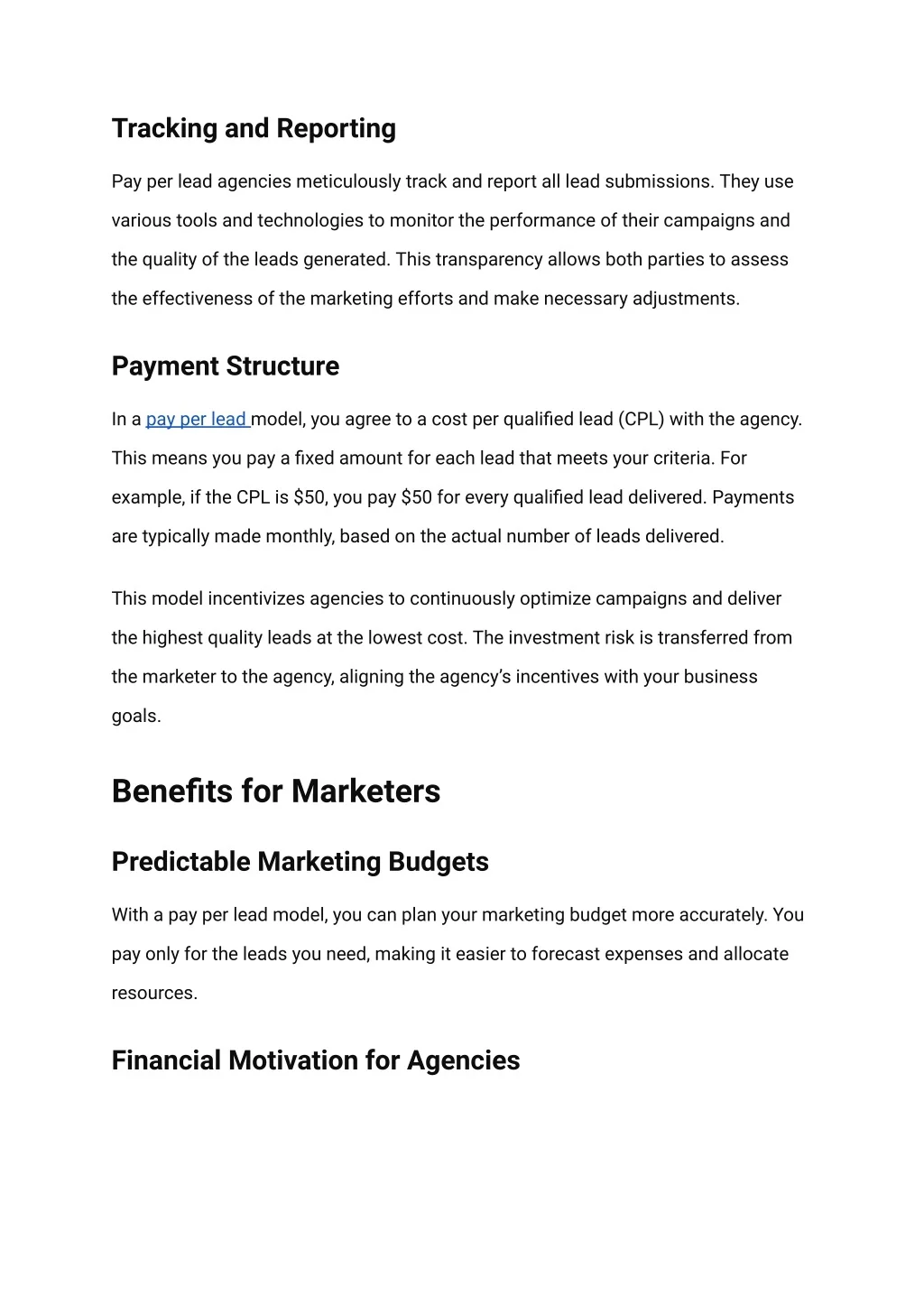 Tracking and Reporting Pay per lead agencies meticulously track and report all lead submissions. They use various tools and technologies to monitor the performance of their campaigns and the quality of the leads generated. This transparency allows both parties to assess the effectiveness of the marketing efforts and make necessary adjustments. Payment Structure In a pay per lead model, you agree to a cost per qualified lead (CPL) with the agency. This means you pay a fixed amount for each lead that meets your criteria. For example, if the CPL is $50, you pay $50 for every qualified lead delivered. Payments are typically made monthly, based on the actual number of leads delivered. This model incentivizes agencies to continuously optimize campaigns and deliver the highest quality leads at the lowest cost. The investment risk is transferred from the marketer to the agency, aligning the agency’s incentives with your business goals. Benefits for Marketers Predictable Marketing Budgets With a pay per lead model, you can plan your marketing budget more accurately. You pay only for the leads you need, making it easier to forecast expenses and allocate resources. Financial Motivation for Agencies
