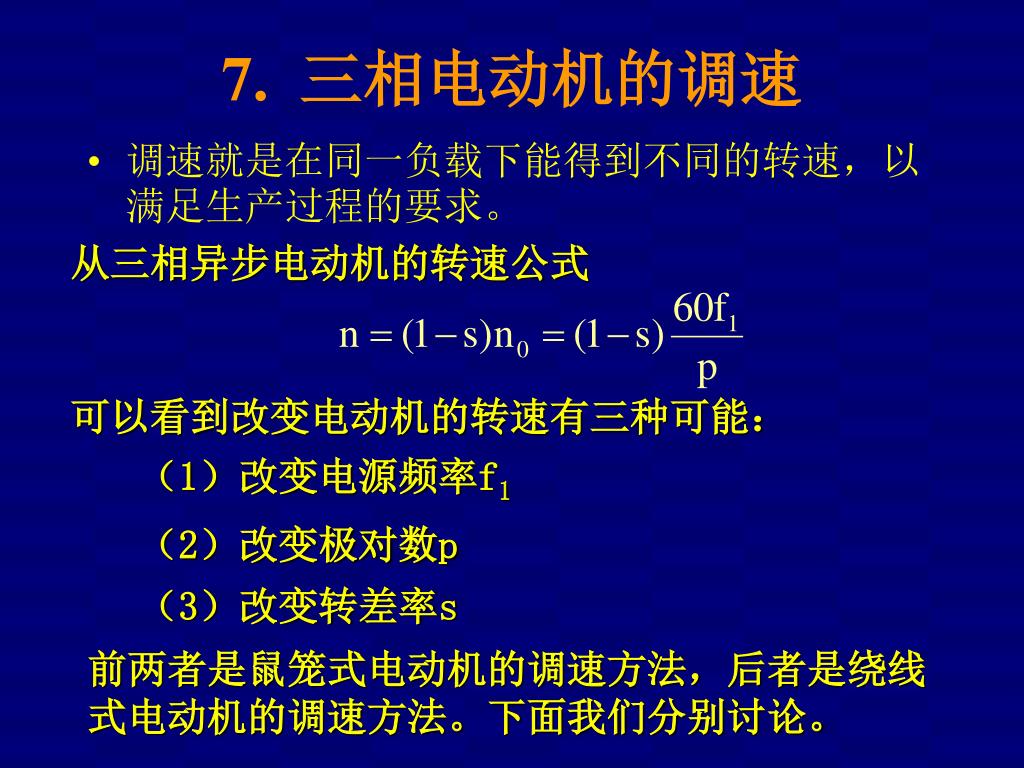 调速就是在同一负载下能得到不同的转速,以满足生产过程的要求。调速就是在同一负载下能得到不同的转速,以满足生产过程的要求。 7. 三相电动机的调速 从三相异步电动机的转速公式 可以看到改变电动机的转速有三种可能: (1)改变电源频率f1 (2)改变极对数p (3)改变转差率s 前两者是鼠笼式电动机的调速方法,后者是绕线式电动机的调速方法。下面我们分别讨论。