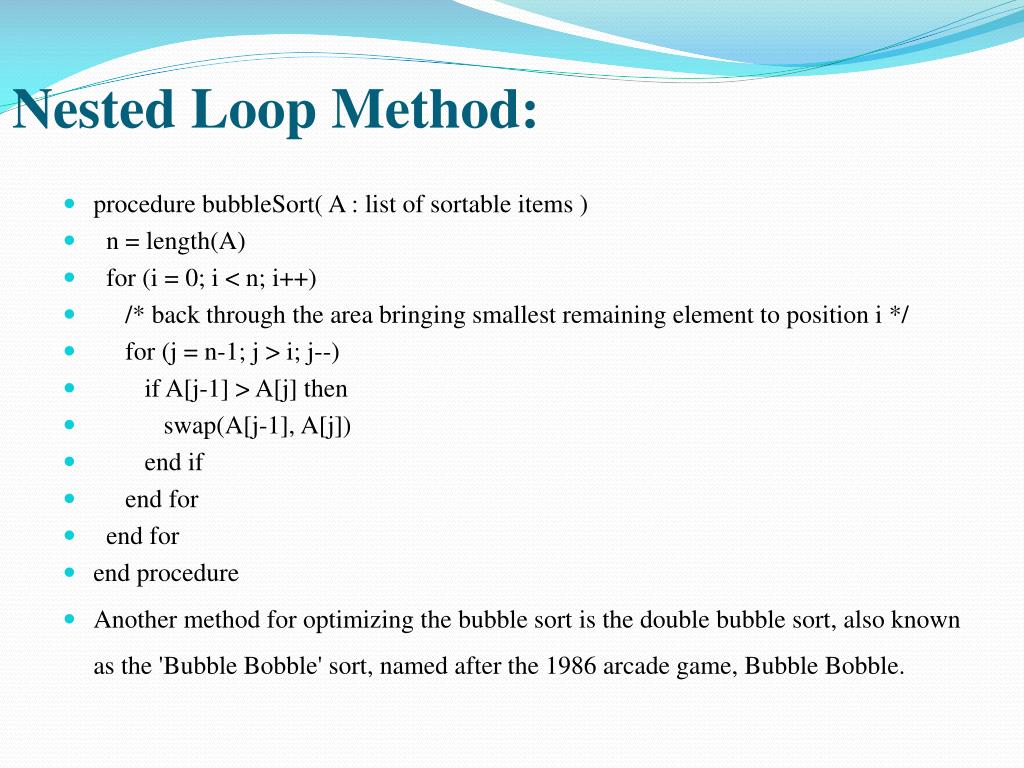 Nested Loop Method: • procedure bubbleSort( A : list of sortable items ) • n = length(A) • for (i = 0; i < n; i++) • /* back through the area bringing smallest remaining element to position i */ • for (j = n-1; j > i; j--) • if A[j-1] > A[j] then • swap(A[j-1], A[j]) • end if • end for • end for • end procedure • Another method for optimizing the bubble sort is the double bubble sort, also known as the 'Bubble Bobble' sort, named after the 1986 arcade game, Bubble Bobble.