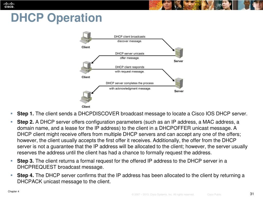 DHCP Operation • Step 1. The client sends a DHCPDISCOVER broadcast message to locate a Cisco IOS DHCP server. • Step 2. A DHCP server offers configuration parameters (such as an IP address, a MAC address, a domain name, and a lease for the IP address) to the client in a DHCPOFFER unicast message. A DHCP client might receive offers from multiple DHCP servers and can accept any one of the offers; however, the client usually accepts the first offer it receives. Additionally, the offer from the DHCP server is not a guarantee that the IP address will be allocated to the client; however, the server usually reserves the address until the client has had a chance to formally request the address. • Step 3. The client returns a formal request for the offered IP address to the DHCP server in a DHCPREQUEST broadcast message. • Step 4. The DHCP server confirms that the IP address has been allocated to the client by returning a DHCPACK unicast message to the client.