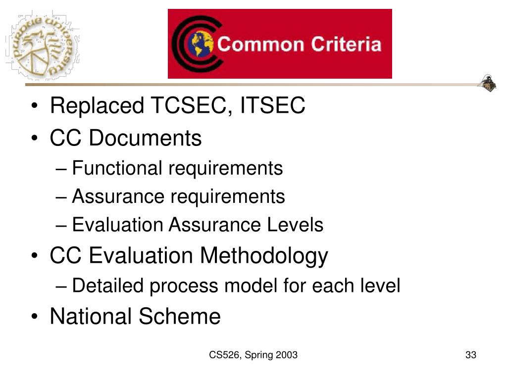 Replaced TCSEC, ITSEC • CC Documents • Functional requirements • Assurance requirements • Evaluation Assurance Levels • CC Evaluation Methodology • Detailed process model for each level • National Scheme CS526, Spring 2003
