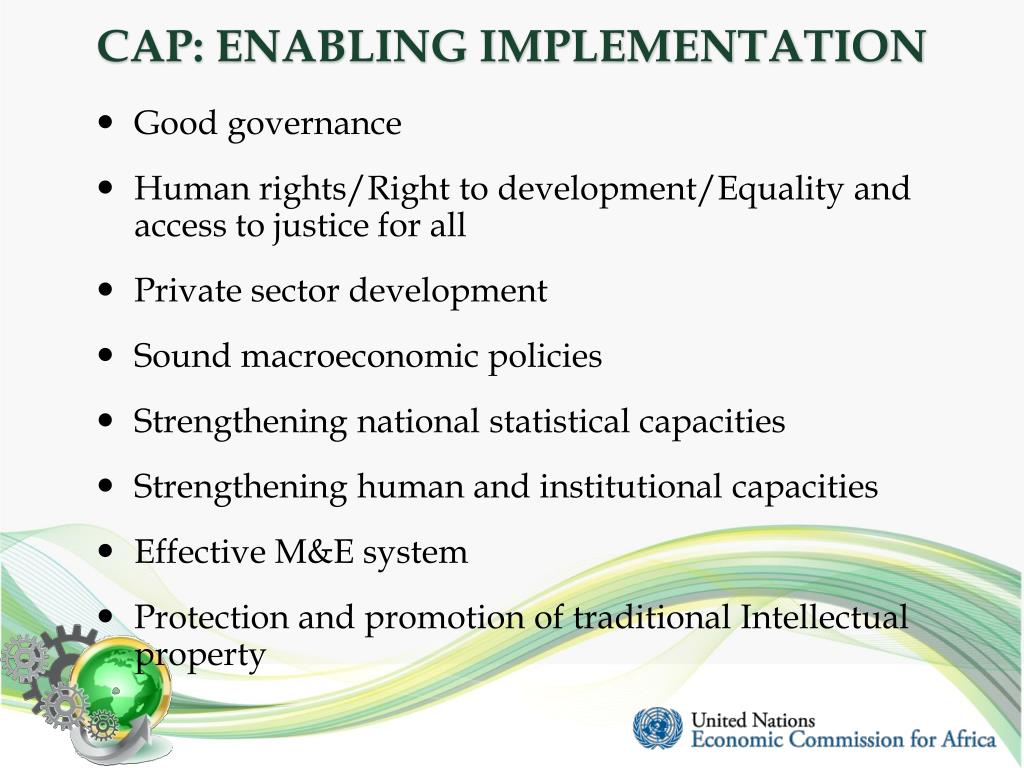CAP: ENABLING IMPLEMENTATION • Good governance • Human rights/Right to development/Equality and access to justice for all • Private sector development • Sound macroeconomic policies • Strengthening national statistical capacities • Strengthening human and institutional capacities • Effective M&E system • Protection and promotion of traditional Intellectual property
