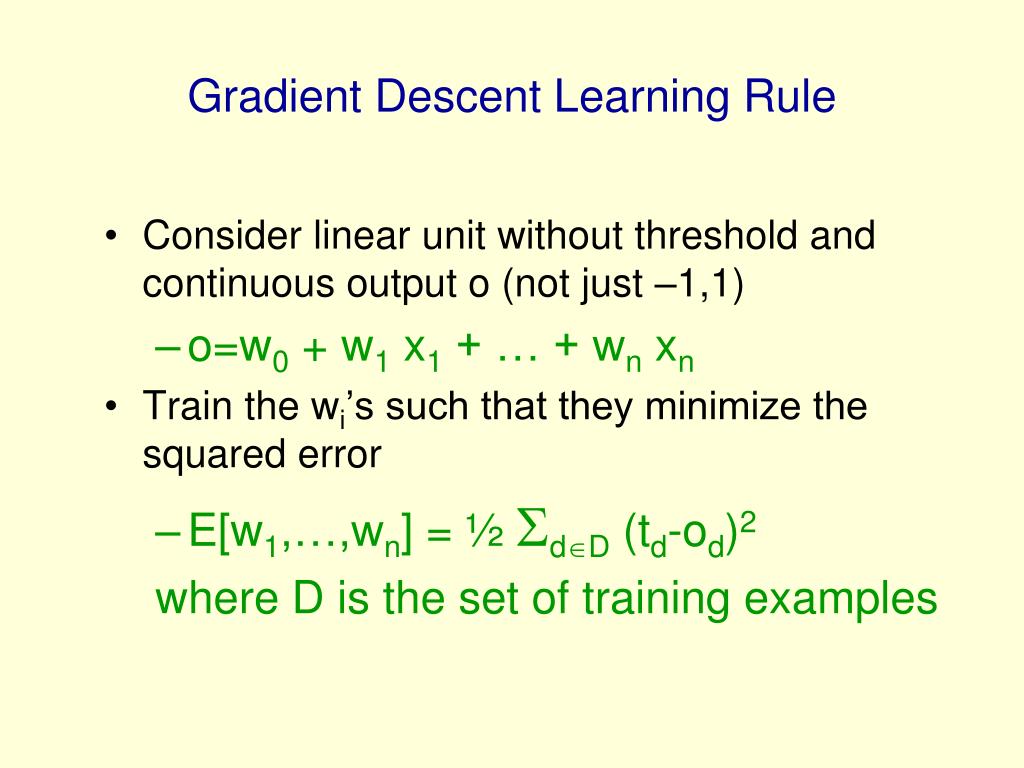 Gradient Descent Learning Rule • Consider linear unit without threshold and continuous output o (not just –1,1) • o=w0 + w1 x1 + … + wn xn • Train the wi’s such that they minimize the squared error • E[w1,…,wn] = ½ dD (td-od)2 where D is the set of training examples