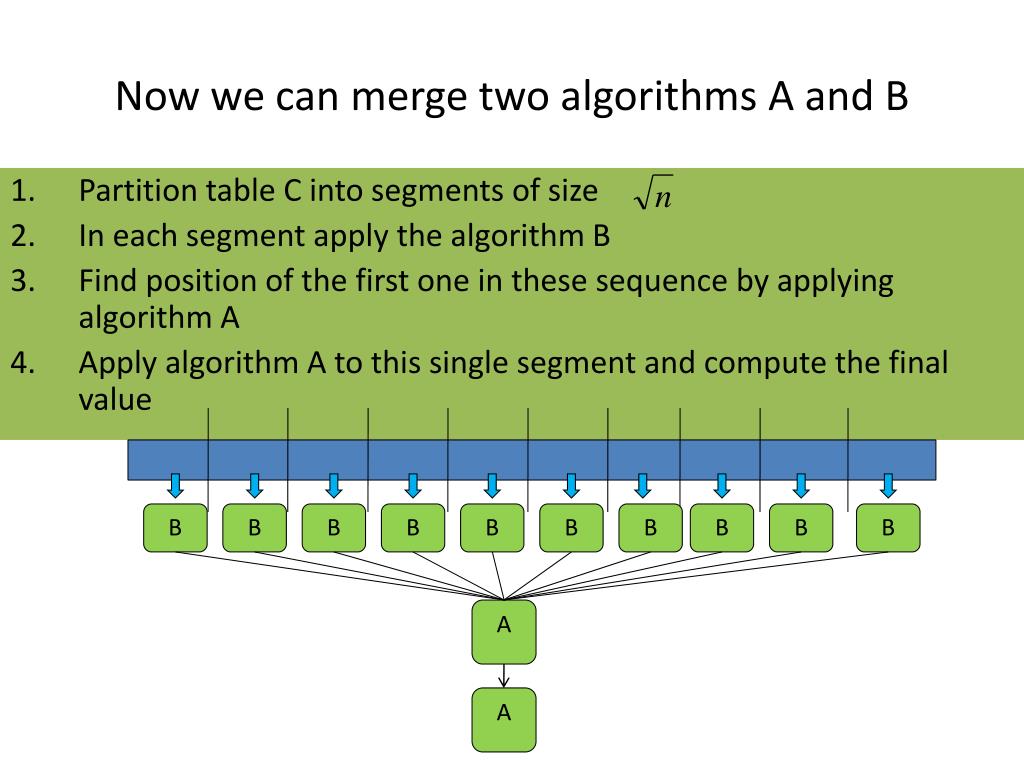 Now we can merge two algorithms A and B • Partition table C into segments of size • In each segment apply the algorithm B • Find position of the first one in these sequence by applying algorithm A • Apply algorithm A to this single segment and compute the final value B B B B B B B B B B A A