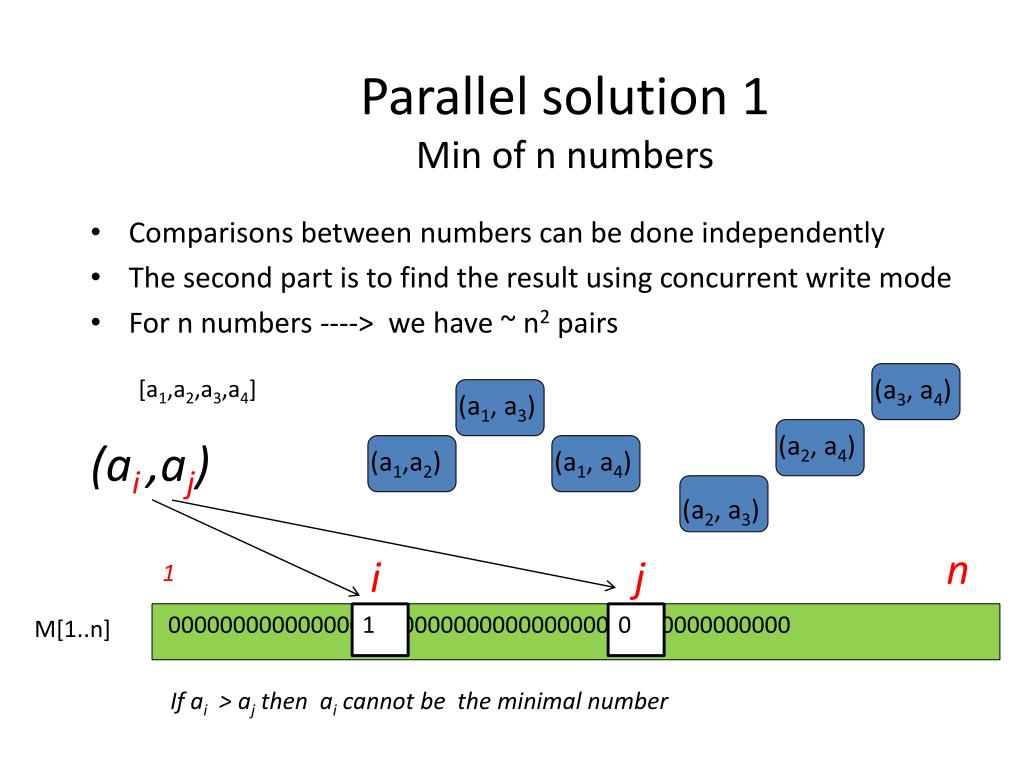 Parallel solution 1Min of n numbers • Comparisons between numbers can be done independently • The second part is to find the result using concurrent write mode • For n numbers ----> we have ~ n2 pairs [a1,a2,a3,a4] (a3, a4) (ai ,aj) (a1, a3) (a2, a4) (a1,a2) (a1, a4) n (a2, a3) i j 1 000000000000000000000000000000000000000000000000 1 0 M[1..n] If ai > aj then ai cannot be the minimal number