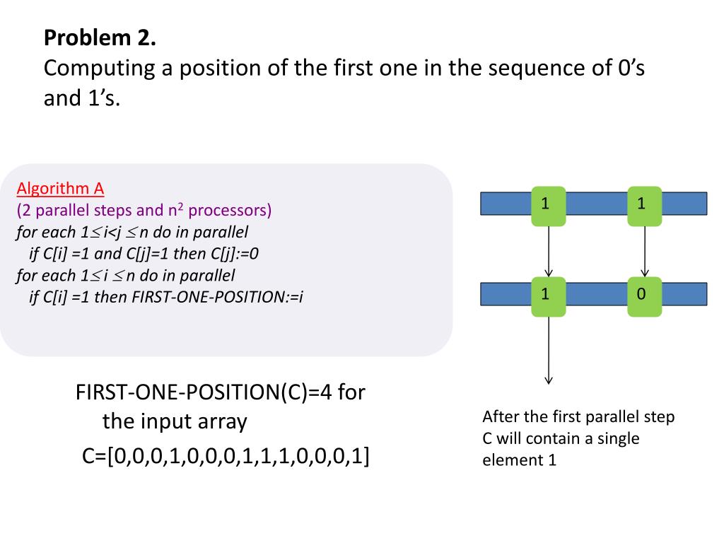 Problem 2.Computing a position of the first one in the sequence of 0’s and 1’s. FIRST-ONE-POSITION(C)=4 for the input array C=[0,0,0,1,0,0,0,1,1,1,0,0,0,1] Algorithm A (2 parallel steps and n2 processors) for each 1 i<j n do in parallel if C[i] =1 and C[j]=1 then C[j]:=0 for each 1 i n do in parallel if C[i] =1 then FIRST-ONE-POSITION:=i 1 1 1 0 After the first parallel step C will contain a single element 1