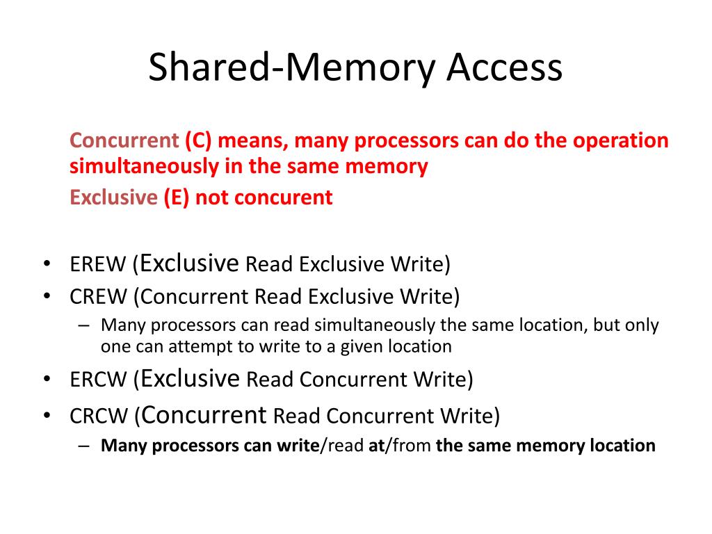 Shared-Memory Access Concurrent (C) means, many processors can do the operation simultaneously in the same memory Exclusive (E) not concurent • EREW (Exclusive Read Exclusive Write) • CREW (Concurrent Read Exclusive Write) • Many processors can read simultaneously the same location, but only one can attempt to write to a given location • ERCW (Exclusive Read Concurrent Write) • CRCW (Concurrent Read Concurrent Write) • Many processors can write/read at/from the same memory location