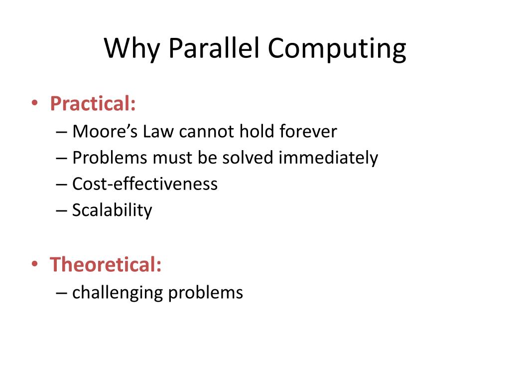 Why Parallel Computing • Practical: • Moore’s Law cannot hold forever • Problems must be solved immediately • Cost-effectiveness • Scalability • Theoretical: • challenging problems