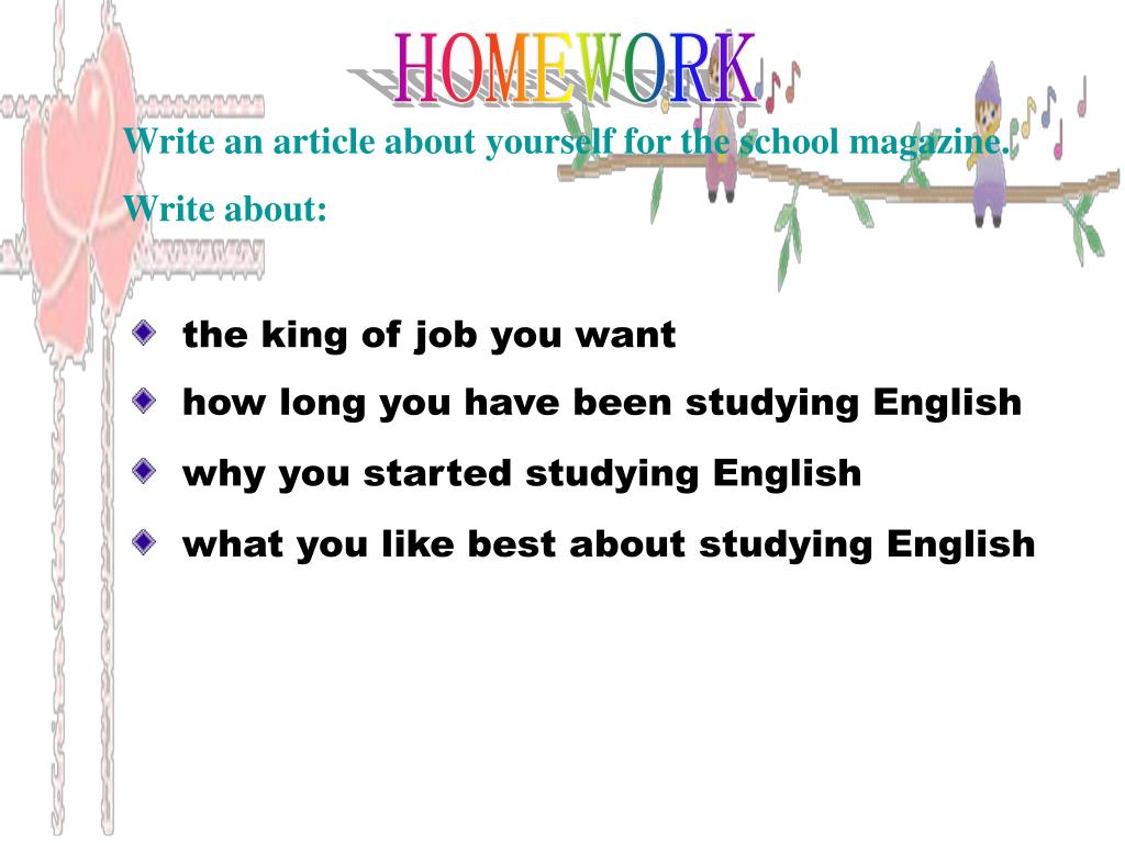 HOMEWORK Write an article about yourself for the school magazine. Write about: • the king of job you want • how long you have been studying English • why you started studying English • what you like best about studying English