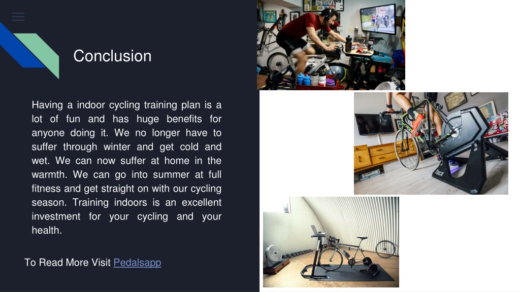 Conclusion Having a indoor cycling training plan is a lot of fun and has huge benefits for anyone doing it. We no longer have to suffer through winter and get cold and wet. We can now suffer at home in the warmth. We can go into summer at full fitness and get straight on with our cycling season. Training indoors is an excellent investment for your cycling and your health. To Read More Visit Pedalsapp