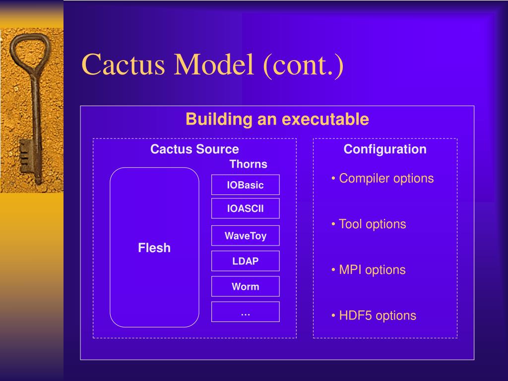 Building an executable Cactus Source Configuration Thorns Flesh • Compiler options • Tool options • MPI options • HDF5 options IOBasic IOASCII WaveToy LDAP Worm … Cactus Model (cont.)