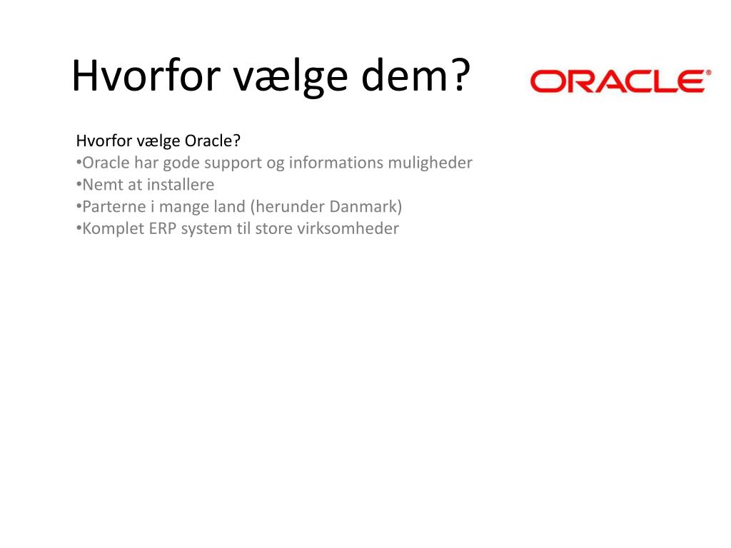 Hvorfor vælge dem? • Hvorfor vælge Oracle? • Oracle har gode support og informations muligheder • Nemt at installere • Parterne i mange land (herunder Danmark) • Komplet ERP system til store virksomheder