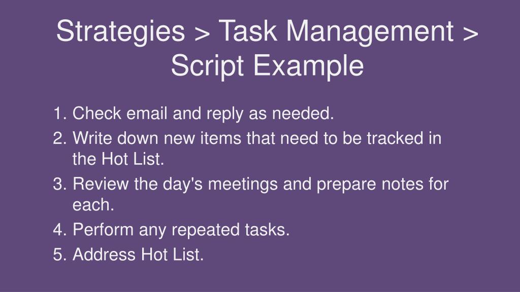 Strategies > Task Management > Script Example Check email and reply as needed. Write down new items that need to be tracked in the Hot List. Review the day's meetings and prepare notes for each. Perform any repeated tasks. Address Hot List.