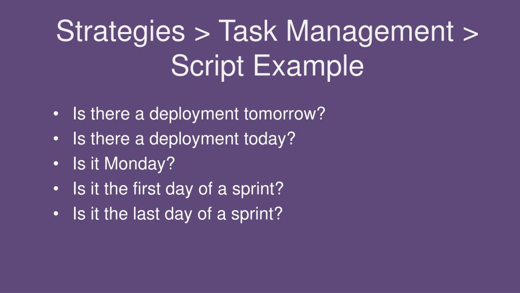 Strategies > Task Management > Script Example Is there a deployment tomorrow? Is there a deployment today? Is it Monday? Is it the first day of a sprint? Is it the last day of a sprint?