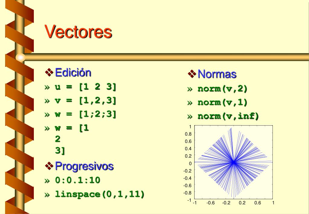 Edición u = [1 2 3] v = [1,2,3] w = [1;2;3] w = [123] Progresivos 0:0.1:10 linspace(0,1,11) Normas norm(v,2) norm(v,1) norm(v,inf) 1 0.8 0.6 0.4 0.2 0 -0.2 -0.4 -0.6 -0.8 -1 -1 -0.6 -0.2 0.2 0.6 1 Vectores