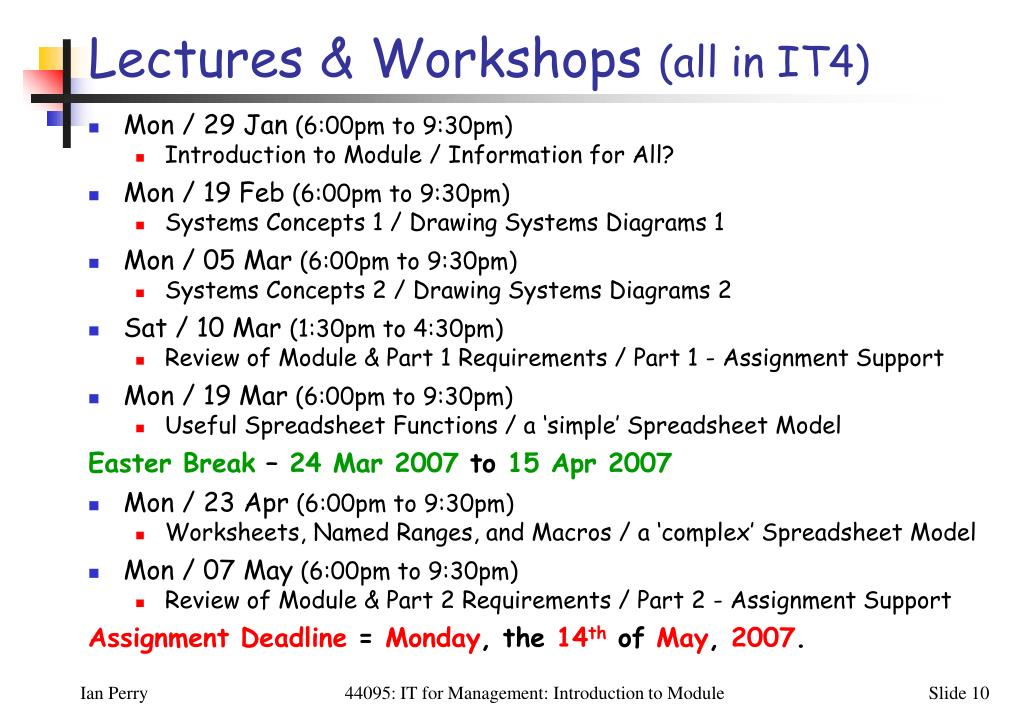 Lectures & Workshops (all in IT4) • Mon / 29 Jan (6:00pm to 9:30pm) • Introduction to Module / Information for All? • Mon / 19 Feb (6:00pm to 9:30pm) • Systems Concepts 1 / Drawing Systems Diagrams 1 • Mon / 05 Mar (6:00pm to 9:30pm) • Systems Concepts 2 / Drawing Systems Diagrams 2 • Sat / 10 Mar (1:30pm to 4:30pm) • Review of Module & Part 1 Requirements / Part 1 - Assignment Support • Mon / 19 Mar (6:00pm to 9:30pm) • Useful Spreadsheet Functions / a ‘simple’ Spreadsheet Model Easter Break – 24 Mar 2007 to 15 Apr 2007 • Mon / 23 Apr (6:00pm to 9:30pm) • Worksheets, Named Ranges, and Macros / a ‘complex’ Spreadsheet Model • Mon / 07 May (6:00pm to 9:30pm) • Review of Module & Part 2 Requirements / Part 2 - Assignment Support Assignment Deadline = Monday, the 14th of May, 2007.