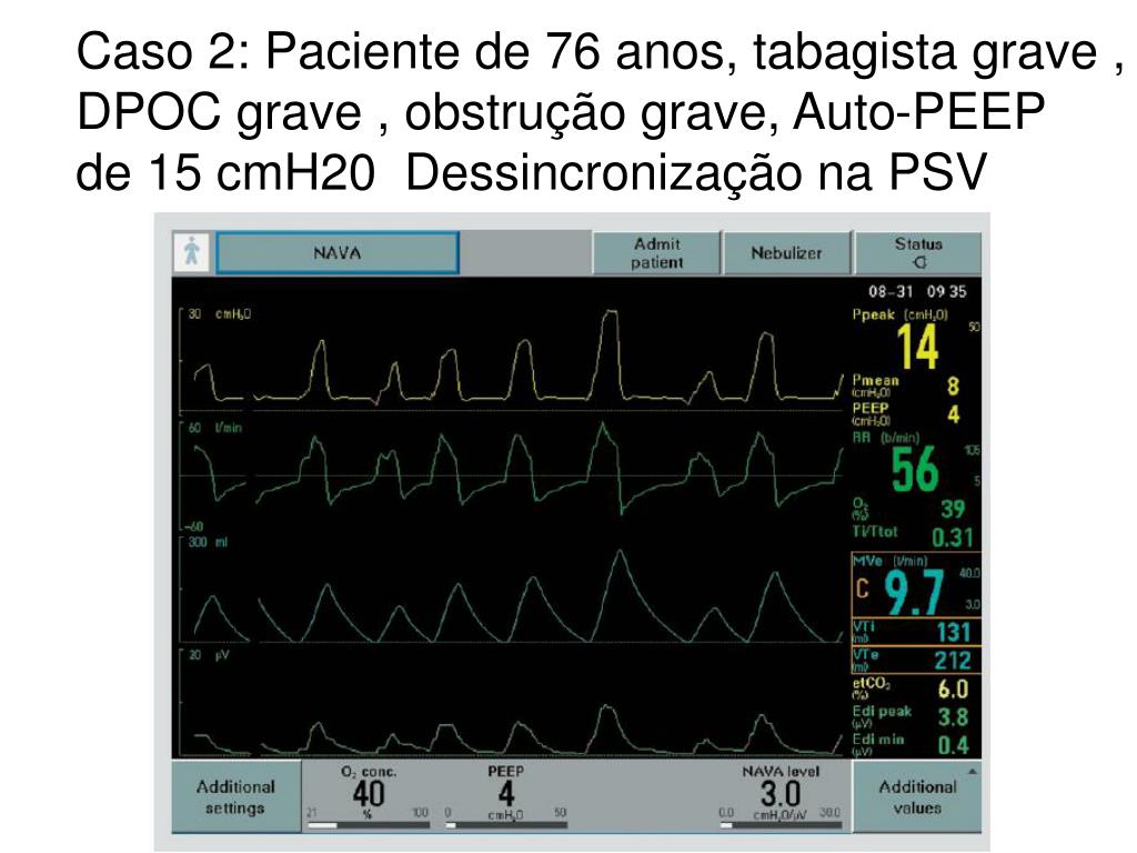 Caso 2: Paciente de 76 anos, tabagista grave , DPOC grave , obstrução grave, Auto-PEEP de 15 cmH20 Dessincronização na PSV
