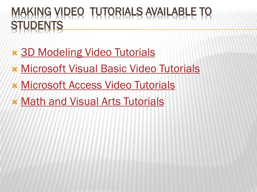 3D Modeling Video Tutorials Microsoft Visual Basic Video Tutorials Microsoft Access Video Tutorials Math and Visual Arts Tutorials Making video tutorials available to students