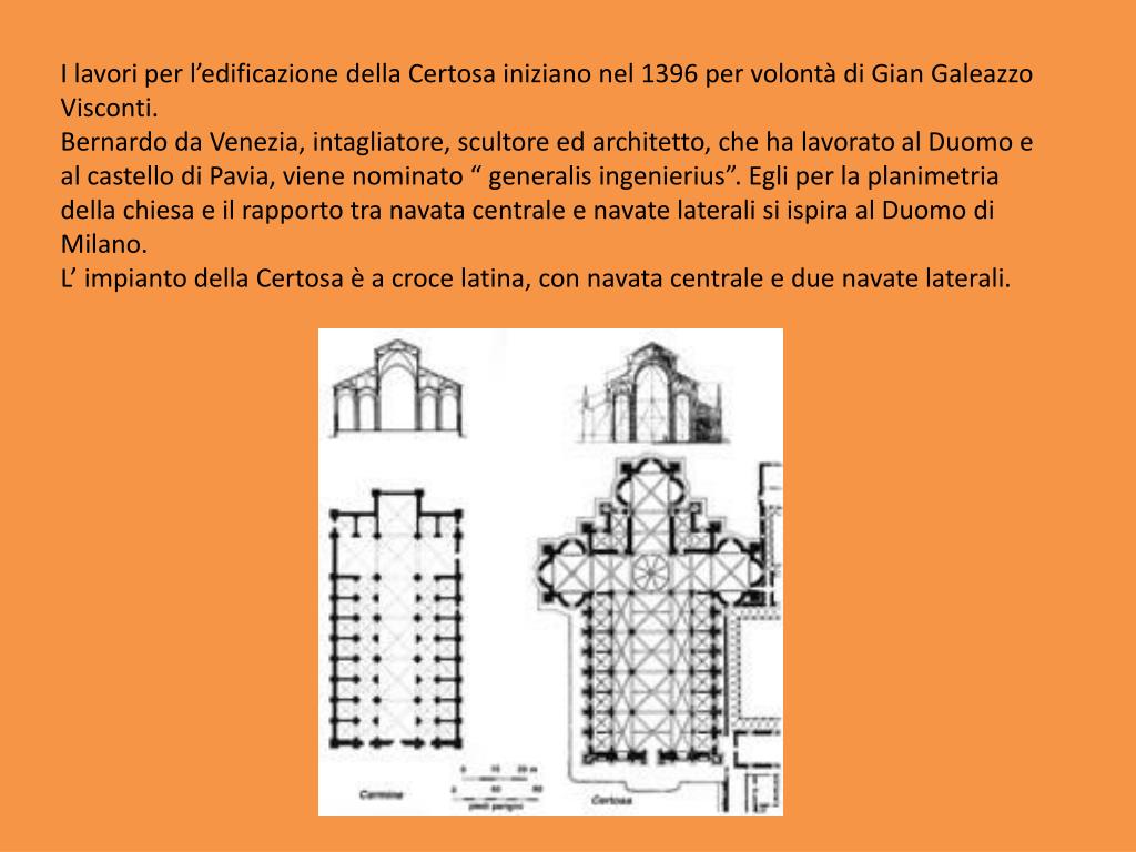 I lavori per l’edificazione della Certosa iniziano nel 1396 per volontà di Gian Galeazzo Visconti. Bernardo da Venezia, intagliatore, scultore ed architetto, che ha lavorato al Duomo e al castello di Pavia, viene nominato “ generalisingenierius”. Egli per la planimetria della chiesa e il rapporto tra navata centrale e navate laterali si ispira al Duomo di Milano. L’ impianto della Certosa è a croce latina, con navata centrale e due navate laterali.