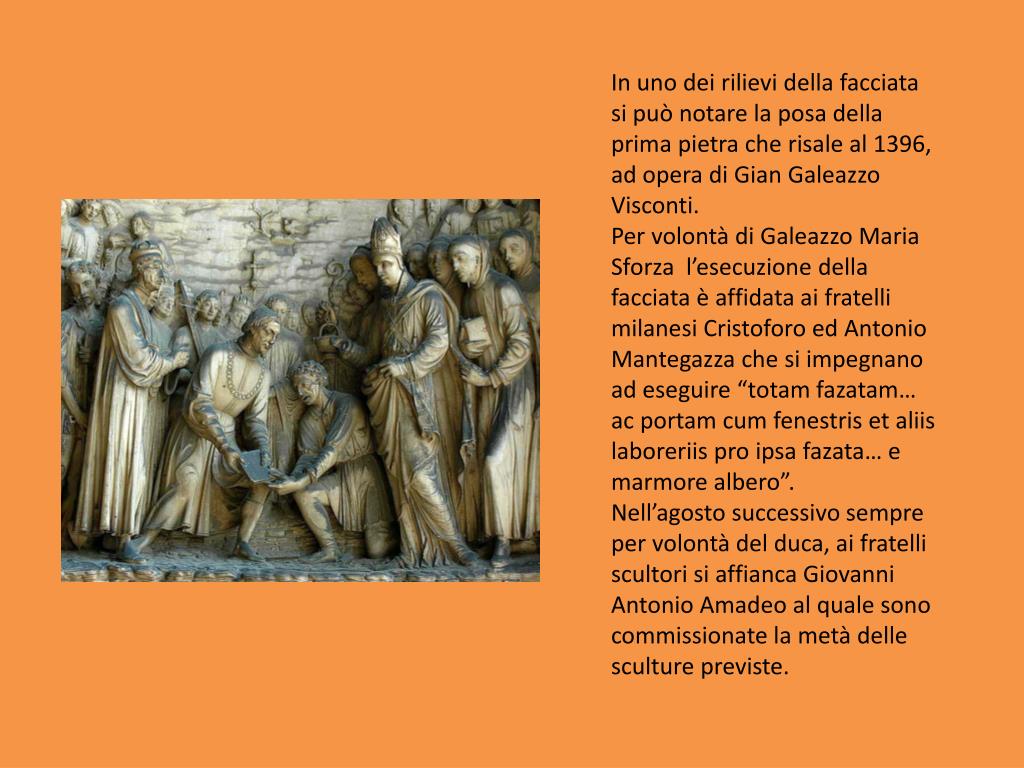In uno dei rilievi della facciata si può notare la posa della prima pietra che risale al 1396, ad opera di Gian Galeazzo Visconti. Per volontà di Galeazzo Maria Sforza l’esecuzione della facciata è affidata ai fratelli milanesi Cristoforo ed Antonio Mantegazza che si impegnano ad eseguire “totamfazatam… ac portamcumfenestrisetaliislaboreriis pro ipsafazata… e marmore albero”. Nell’agosto successivo sempre per volontà del duca, ai fratelli scultori si affianca Giovanni Antonio Amadeo al quale sono commissionate la metà delle sculture previste.