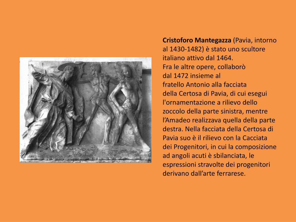 Cristoforo Mantegazza (Pavia, intorno al 1430-1482) è stato uno scultore italiano attivo dal 1464. Fra le altre opere, collaborò dal 1472 insieme al fratello Antonio alla facciata della Certosa di Pavia, di cui esegui l'ornamentazione a rilievo dello zoccolo della parte sinistra, mentre l’Amadeo realizzava quella della parte destra. Nella facciata della Certosa di Pavia suo è il rilievo con la Cacciata dei Progenitori, in cui la composizione ad angoli acuti è sbilanciata, le espressioni stravolte dei progenitori derivano dall’arte ferrarese.