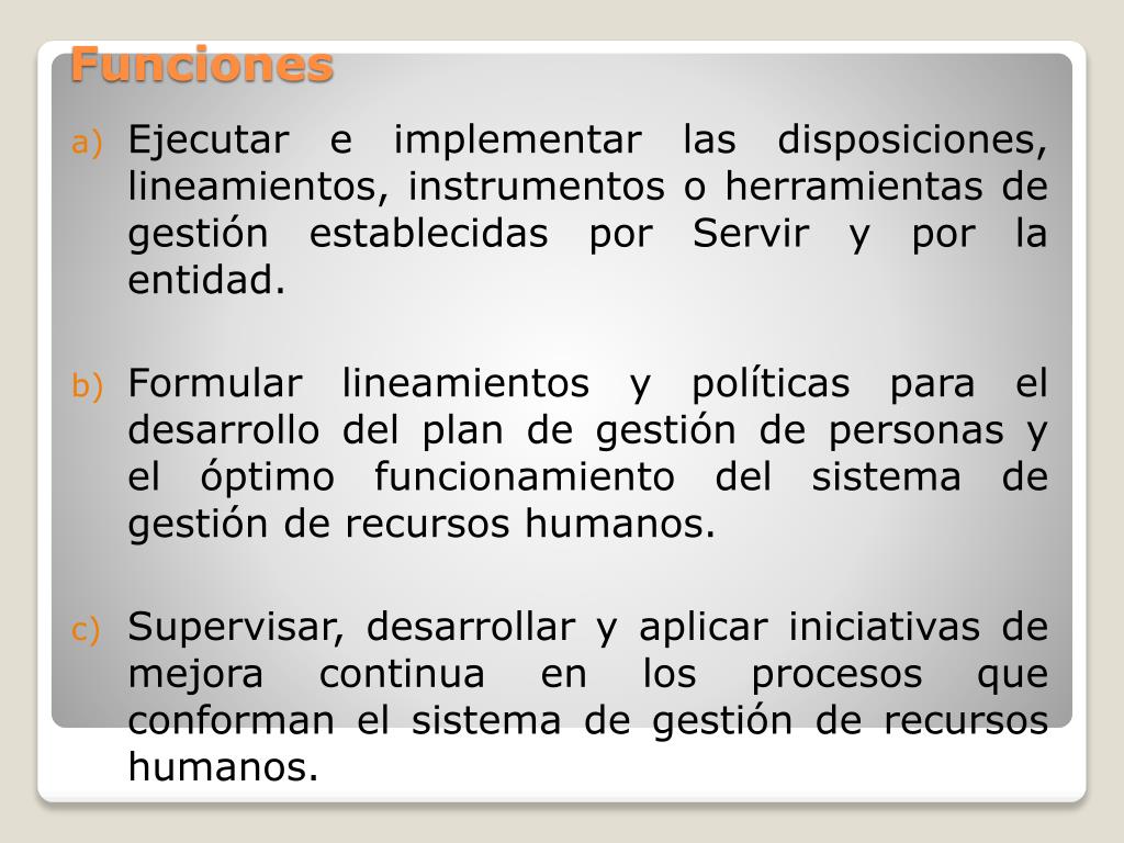 Ejecutar e implementar las disposiciones, lineamientos, instrumentos o herramientas de gestión establecidas por Servir y por la entidad. • Formular lineamientos y políticas para el desarrollo del plan de gestión de personas y el óptimo funcionamiento del sistema de gestión de recursos humanos. • Supervisar, desarrollar y aplicar iniciativas de mejora continua en los procesos que conforman el sistema de gestión de recursos humanos. Funciones