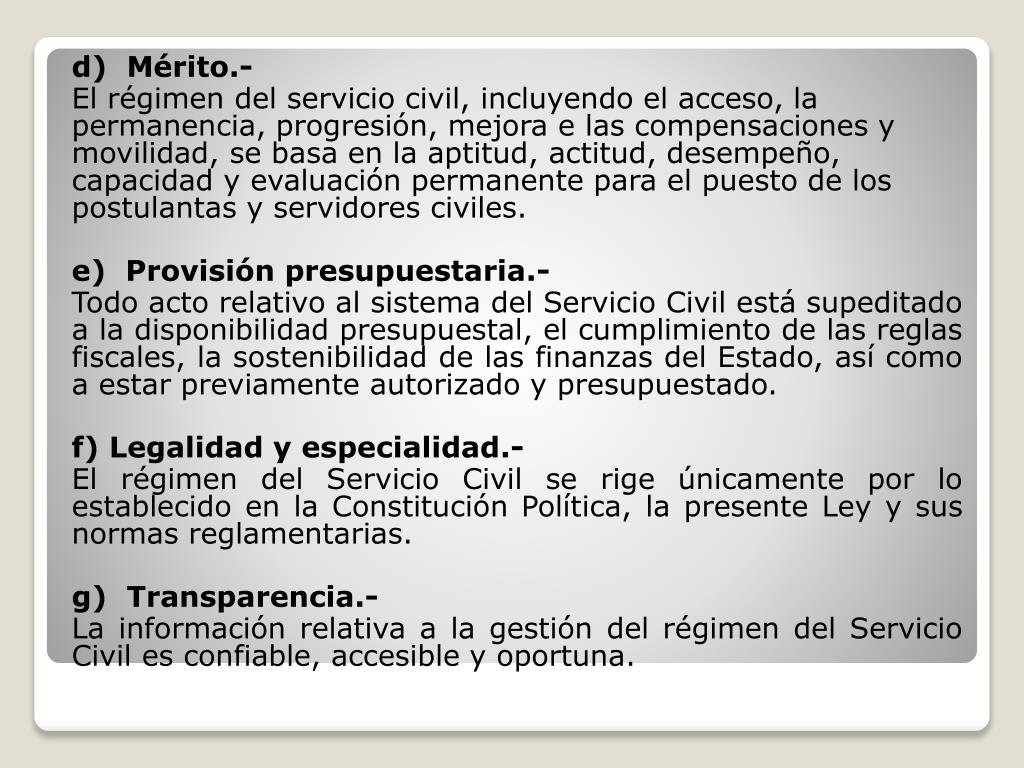 d) Mérito.- El régimen del servicio civil, incluyendo el acceso, la permanencia, progresión, mejora e las compensaciones y movilidad, se basa en la aptitud, actitud, desempeño, capacidad y evaluación permanente para el puesto de los postulantas y servidores civiles. e) Provisión presupuestaria.- Todo acto relativo al sistema del Servicio Civil está supeditado a la disponibilidad presupuestal, el cumplimiento de las reglas fiscales, la sostenibilidad de las finanzas del Estado, así como a estar previamente autorizado y presupuestado. f) Legalidad y especialidad.- El régimen del Servicio Civil se rige únicamente por lo establecido en la Constitución Política, la presente Ley y sus normas reglamentarias. g) Transparencia.- La información relativa a la gestión del régimen del Servicio Civil es confiable, accesible y oportuna.