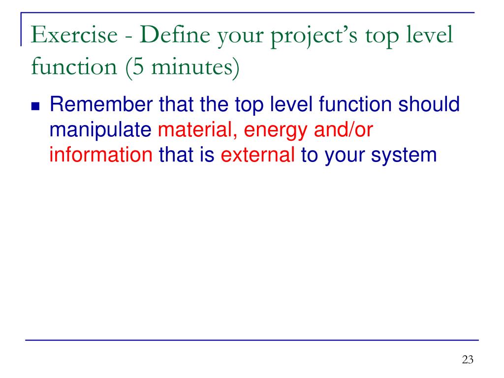 Exercise - Define your project’s top level function (5 minutes) • Remember that the top level function should manipulate material, energy and/or information that is external to your system