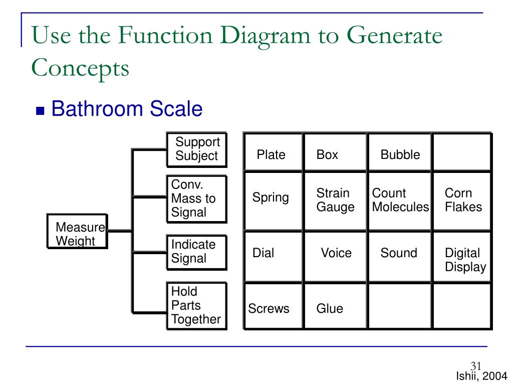 Use the Function Diagram to Generate Concepts • Bathroom Scale Support Subject Plate Box Bubble Conv. Mass to Signal Strain Gauge Count Molecules Corn Flakes Spring Measure Weight Indicate Signal Dial Voice Sound Digital Display Hold Parts Together Screws Glue Ishii, 2004