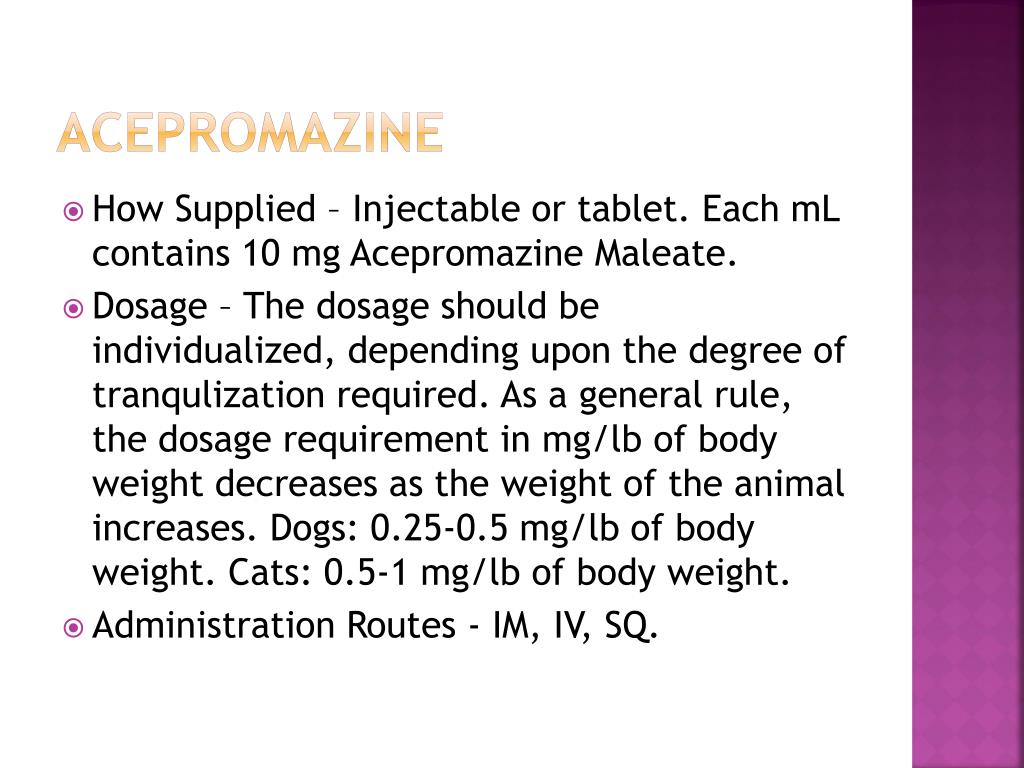 acepromazine • How Supplied – Injectable or tablet. Each mL contains 10 mg AcepromazineMaleate. • Dosage – The dosage should be individualized, depending upon the degree of tranqulization required. As a general rule, the dosage requirement in mg/lb of body weight decreases as the weight of the animal increases. Dogs: 0.25-0.5 mg/lb of body weight. Cats: 0.5-1 mg/lb of body weight. • Administration Routes - IM, IV, SQ.