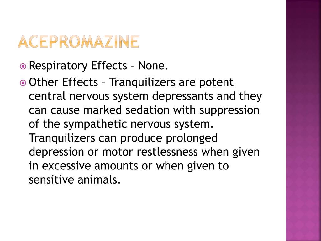 acepromazine • Respiratory Effects – None. • Other Effects – Tranquilizers are potent central nervous system depressants and they can cause marked sedation with suppression of the sympathetic nervous system. Tranquilizers can produce prolonged depression or motor restlessness when given in excessive amounts or when given to sensitive animals.