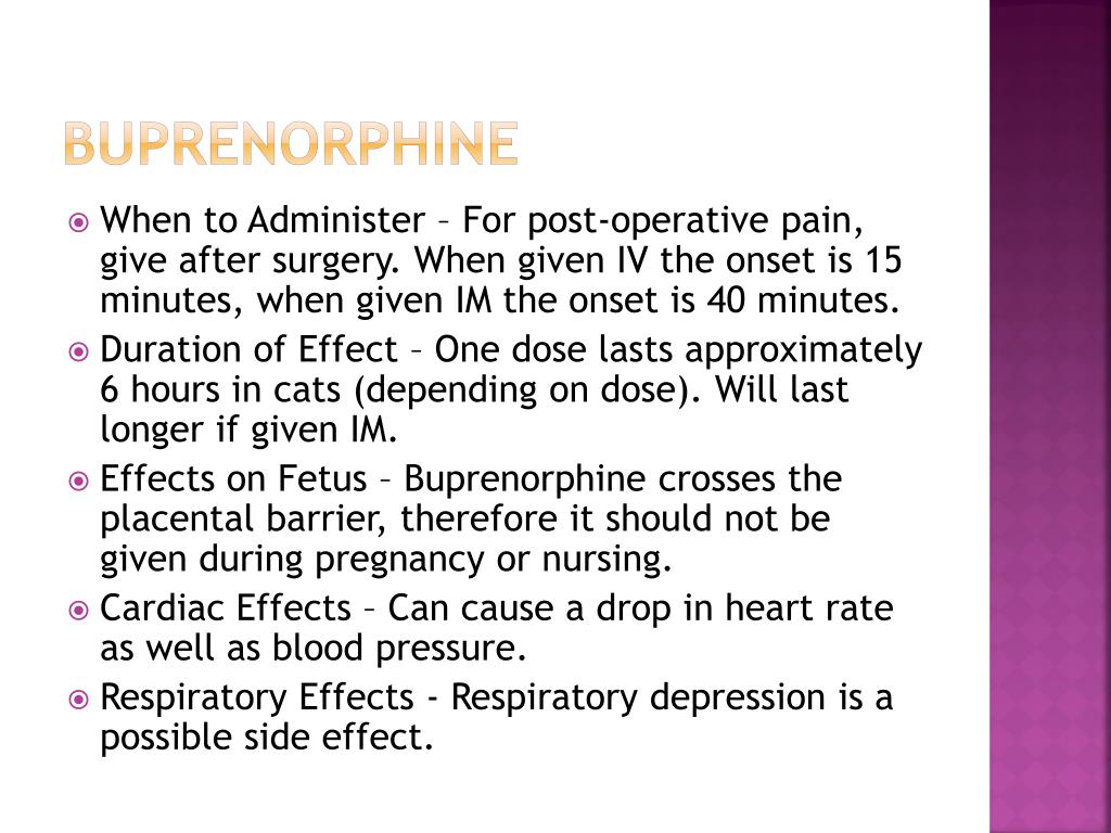 buprenorphine • When to Administer – For post-operative pain, give after surgery. When given IV the onset is 15 minutes, when given IM the onset is 40 minutes. • Duration of Effect – One dose lasts approximately 6 hours in cats (depending on dose). Will last longer if given IM. • Effects on Fetus – Buprenorphine crosses the placental barrier, therefore it should not be given during pregnancy or nursing. • Cardiac Effects – Can cause a drop in heart rate as well as blood pressure. • Respiratory Effects - Respiratory depression is a possible side effect.