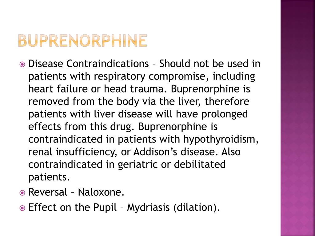 buprenorphine • Disease Contraindications – Should not be used in patients with respiratory compromise, including heart failure or head trauma. Buprenorphine is removed from the body via the liver, therefore patients with liver disease will have prolonged effects from this drug. Buprenorphine is contraindicated in patients with hypothyroidism, renal insufficiency, or Addison’s disease. Also contraindicated in geriatric or debilitated patients. • Reversal – Naloxone. • Effect on the Pupil – Mydriasis (dilation).