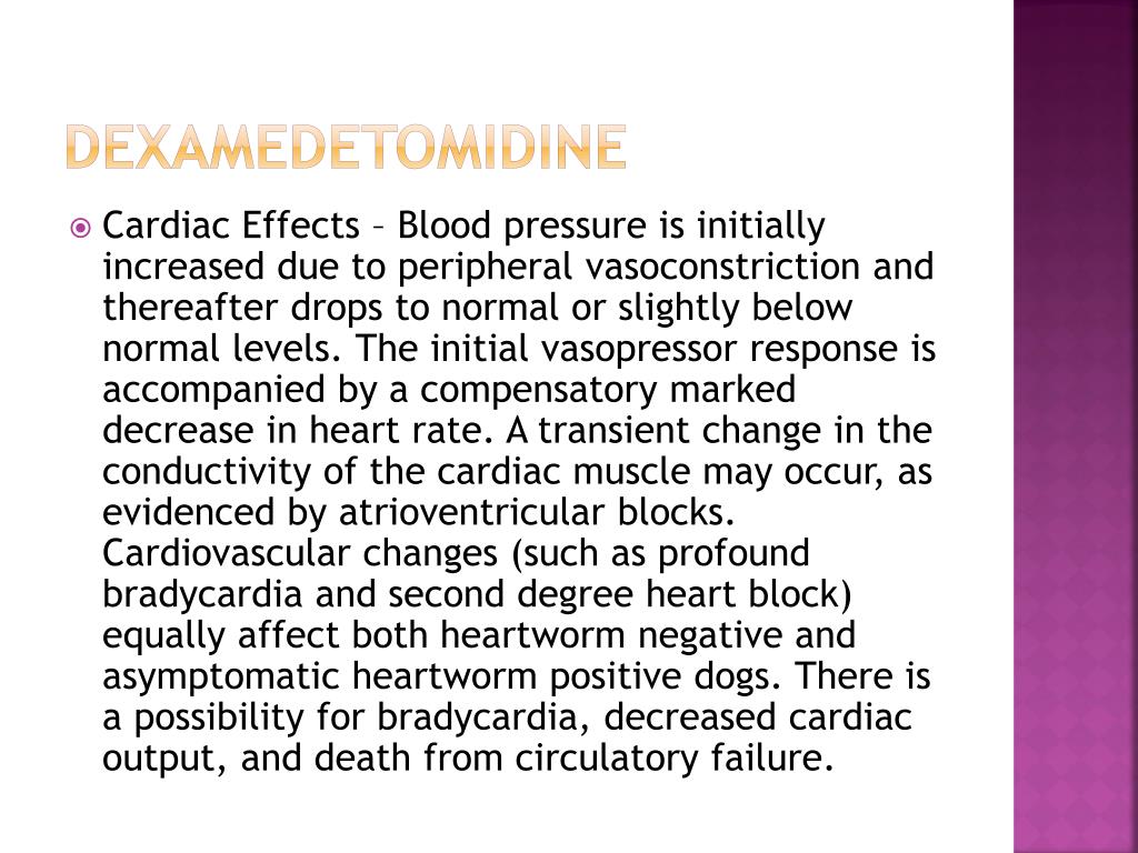 dexamedetomidine • Cardiac Effects – Blood pressure is initially increased due to peripheral vasoconstriction and thereafter drops to normal or slightly below normal levels. The initial vasopressor response is accompanied by a compensatory marked decrease in heart rate. A transient change in the conductivity of the cardiac muscle may occur, as evidenced by atrioventricular blocks. Cardiovascular changes (such as profound bradycardia and second degree heart block) equally affect both heartworm negative and asymptomatic heartworm positive dogs. There is a possibility for bradycardia, decreased cardiac output, and death from circulatory failure.