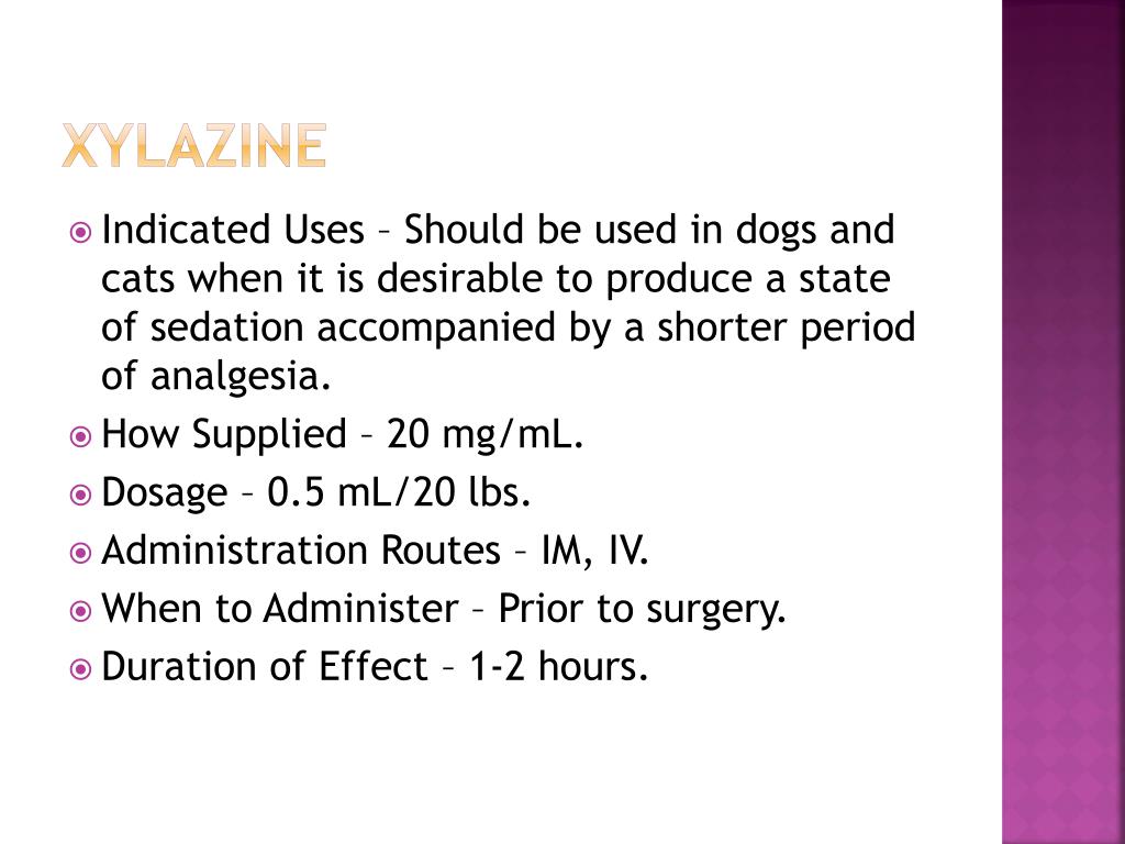 xylazine • Indicated Uses – Should be used in dogs and cats when it is desirable to produce a state of sedation accompanied by a shorter period of analgesia. • How Supplied – 20 mg/mL. • Dosage – 0.5 mL/20 lbs. • Administration Routes – IM, IV. • When to Administer – Prior to surgery. • Duration of Effect – 1-2 hours.