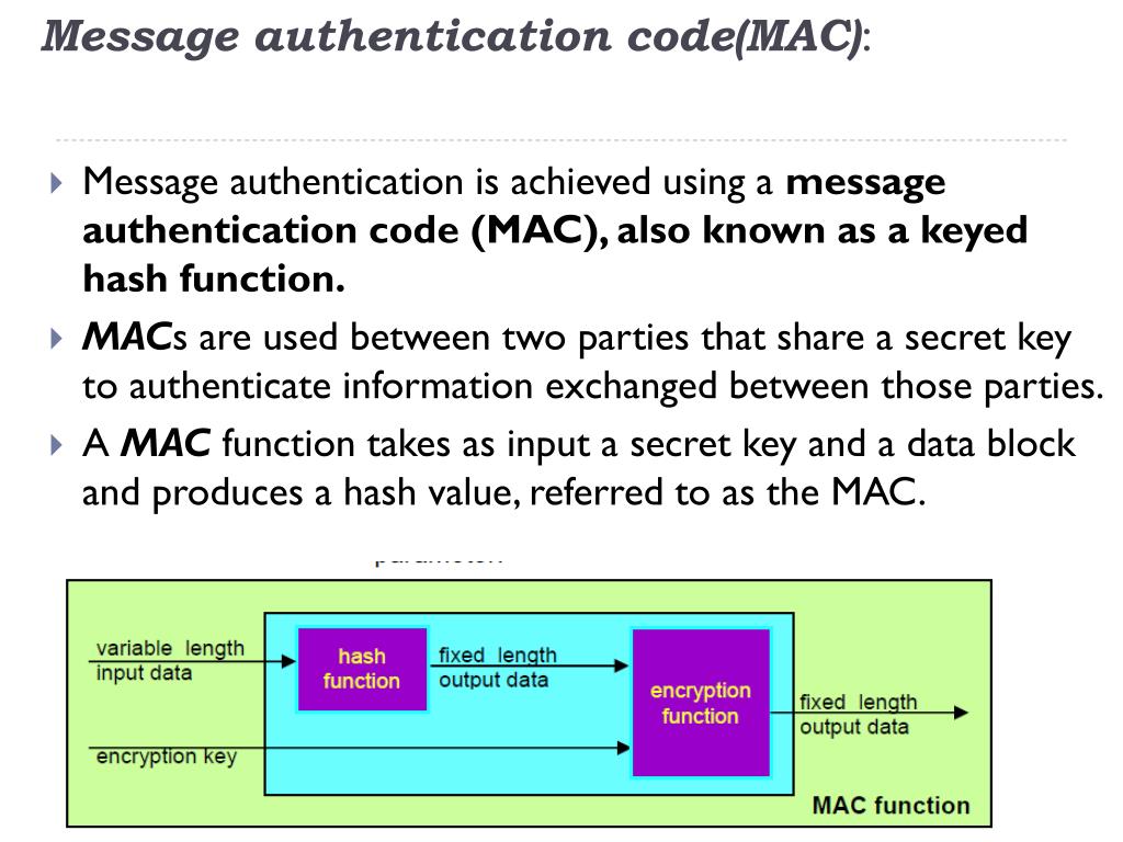 Message authentication code(MAC): • Message authentication is achieved using a message authentication code (MAC), also known as a keyed hash function. • MACs are used between two parties that share a secret key to authenticate information exchanged between those parties. • A MAC function takes as input a secret key and a data block and produces a hash value, referred to as the MAC.