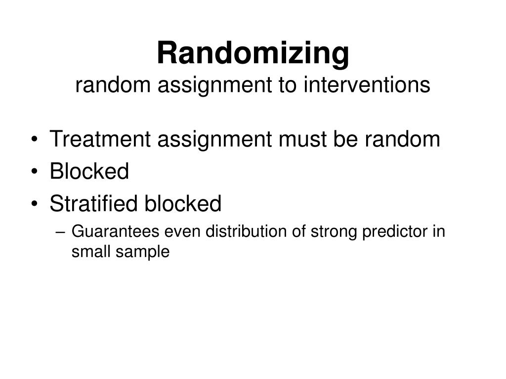 Randomizing random assignment to interventions • Treatment assignment must be random • Blocked • Stratified blocked • Guarantees even distribution of strong predictor in small sample