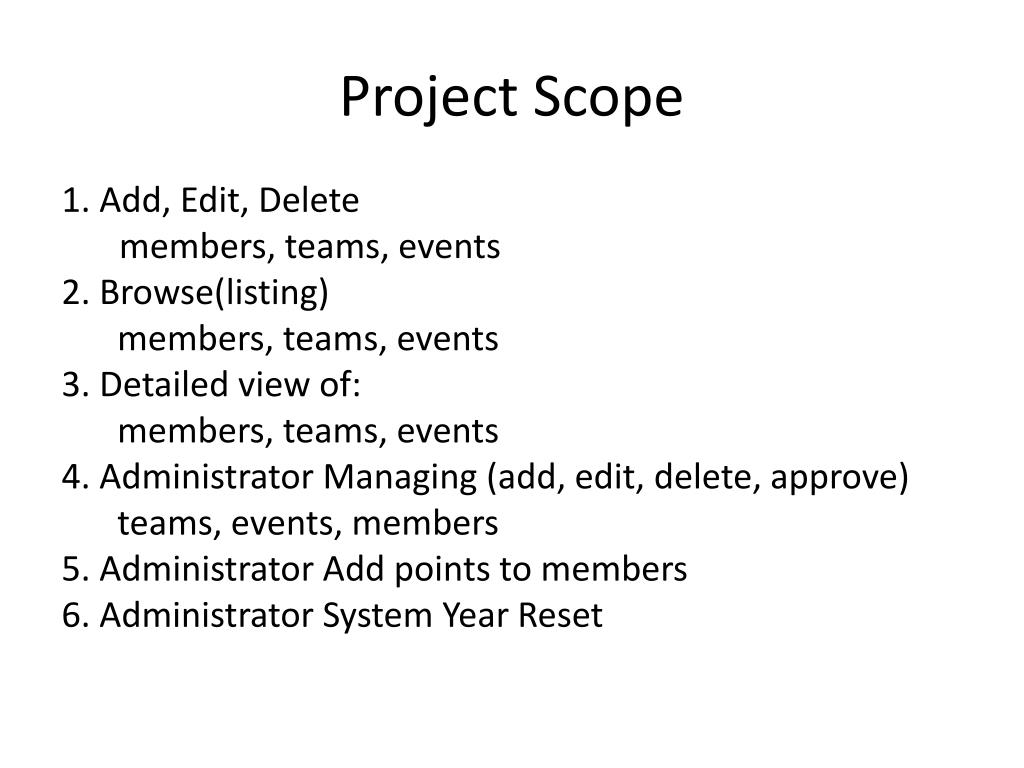 Project Scope 1. Add, Edit, Delete members, teams, events 2. Browse(listing) members, teams, events 3. Detailed view of: members, teams, events 4. Administrator Managing (add, edit, delete, approve) teams, events, members 5. Administrator Add points to members 6. Administrator System Year Reset