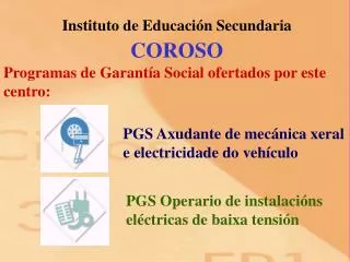 Instituto de Educación Secundaria COROSO Programas de Garantía Social ofertados por este centro: PGS Axudante de mecánica xeral e electricidade do vehículo PGS Operario de instalacións eléctricas de baixa tensión