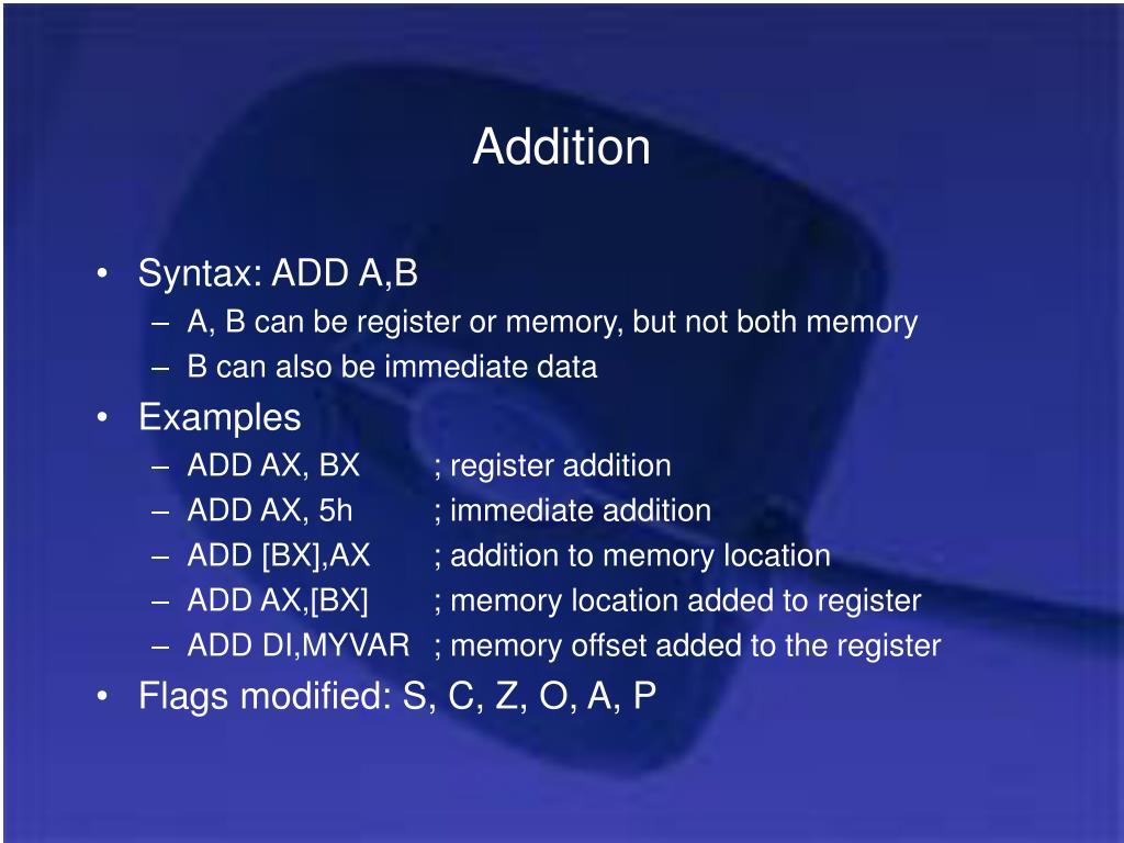 Addition • Syntax: ADD A,B • A, B can be register or memory, but not both memory • B can also be immediate data • Examples • ADD AX, BX ; register addition • ADD AX, 5h ; immediate addition • ADD [BX],AX ; addition to memory location • ADD AX,[BX] ; memory location added to register • ADD DI,MYVAR ; memory offset added to the register • Flags modified: S, C, Z, O, A, P