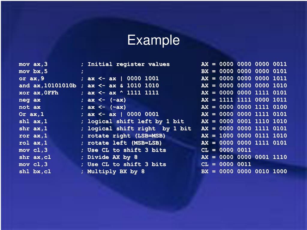 Example mov ax,3 ; Initial register values AX = 0000 0000 0000 0011 mov bx,5 ; BX = 0000 0000 0000 0101 or ax,9 ; ax <- ax | 0000 1001 AX = 0000 0000 0000 1011 and ax,10101010b ; ax <- ax & 1010 1010 AX = 0000 0000 0000 1010 xor ax,0FFh ; ax <- ax ^ 1111 1111 AX = 0000 0000 1111 0101 neg ax ; ax <- (-ax) AX = 1111 1111 0000 1011 not ax ; ax <- (~ax) AX = 0000 0000 1111 0100 Or ax,1 ; ax <- ax | 0000 0001 AX = 0000 0000 1111 0101 shl ax,1 ; logical shift left by 1 bit AX = 0000 0001 1110 1010 shr ax,1 ; logical shift right by 1 bit AX = 0000 0000 1111 0101 ror ax,1 ; rotate right (LSB=MSB) AX = 1000 0000 0111 1010 rol ax,1 ; rotate left (MSB=LSB) AX = 0000 0000 1111 0101 mov cl,3 ; Use CL to shift 3 bits CL = 0000 0011 shr ax,cl ; Divide AX by 8 AX = 0000 0000 0001 1110 mov cl,3 ; Use CL to shift 3 bits CL = 0000 0011 shl bx,cl ; Multiply BX by 8 BX = 0000 0000 0010 1000