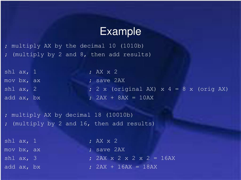 Example ; multiply AX by the decimal 10 (1010b) ; (multiply by 2 and 8, then add results) shl ax, 1 ; AX x 2 mov bx, ax ; save 2AX shl ax, 2 ; 2 x (original AX) x 4 = 8 x (orig AX) add ax, bx ; 2AX + 8AX = 10AX ; multiply AX by decimal 18 (10010b) ; (multiply by 2 and 16, then add results) shl ax, 1 ; AX x 2 mov bx, ax ; save 2AX shl ax, 3 ; 2AX x 2 x 2 x 2 = 16AX add ax, bx ; 2AX + 16AX = 18AX
