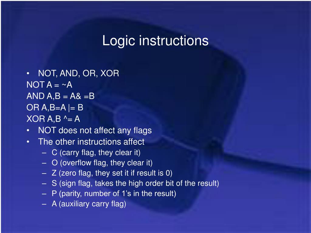 Examples of logic instructions AL 1100 1010 AL 0011 0101 NOT AL BL 0110 1101 AL 0011 0101 OR AL, BL AL 0111 1101 AL 0011 0101 BL 0110 1101 AL 0011 0101 AND AL, BL BL 0000 1111 OR AL, BL AL 0010 0101 AL 0011 1111 AL 0011 0101 BL 0000 1111 AL 0011 0101 AND AL, BL BL 0110 1101 XOR AL, BL AL 0000 0101 AL 0101 1000
