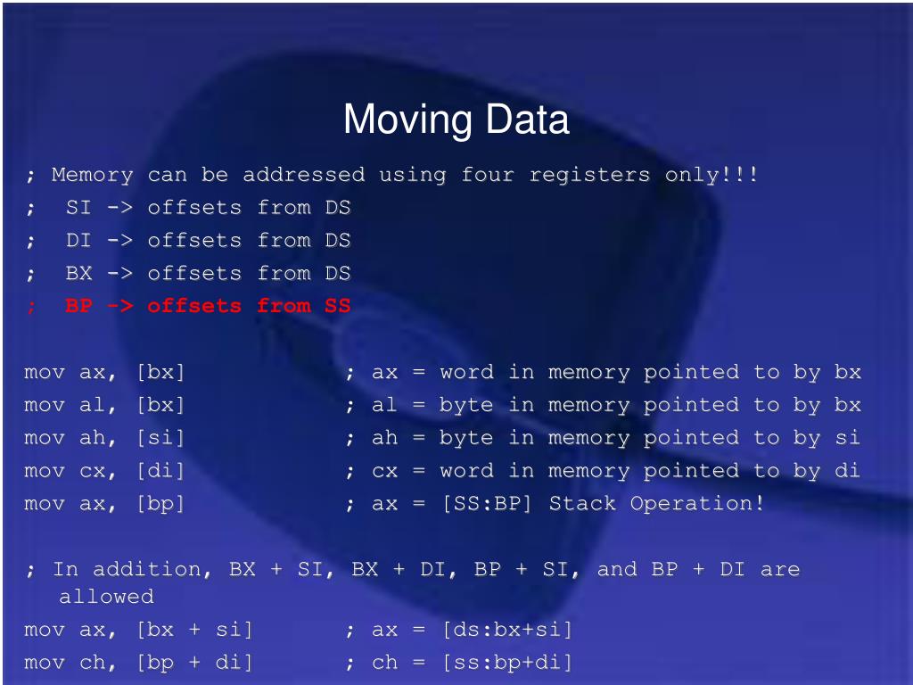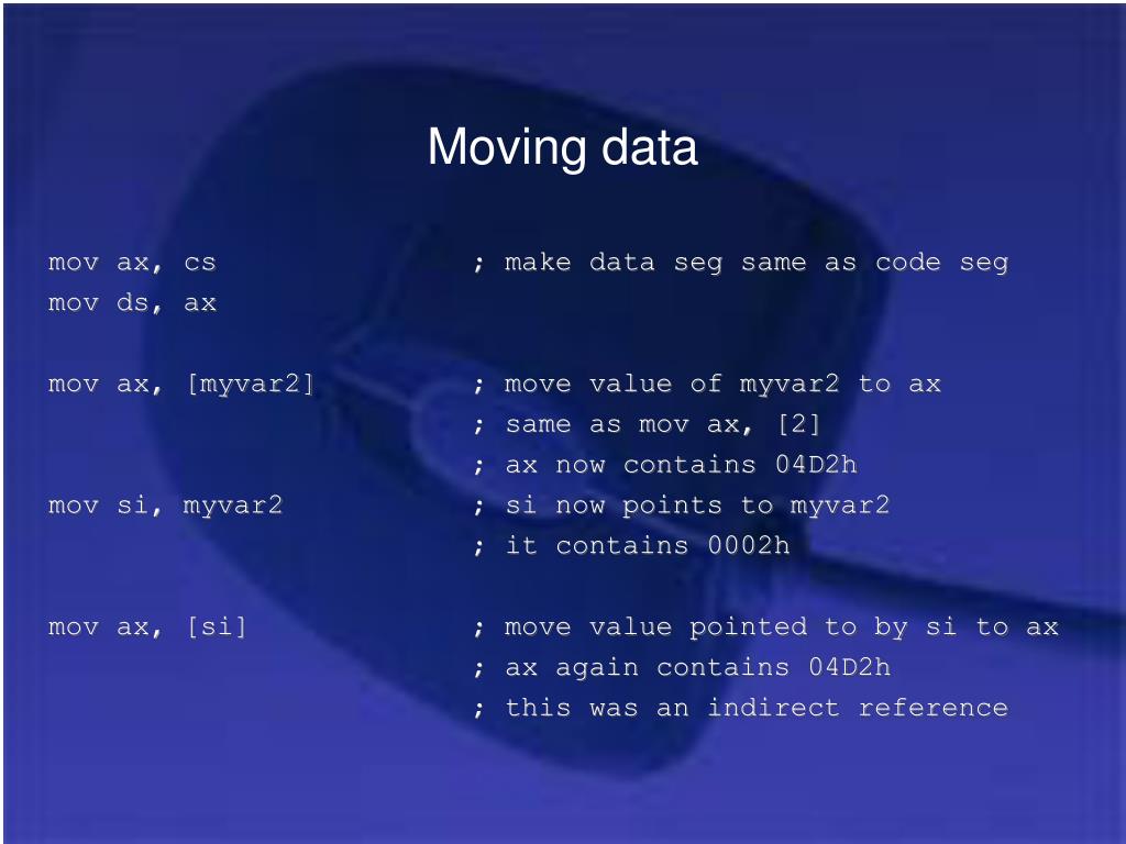 Moving data mov ax, cs ; make data seg same as code seg mov ds, ax mov ax, [myvar2] ; move value of myvar2 to ax ; same as mov ax, [2] ; ax now contains 04D2h mov si, myvar2 ; si now points to myvar2 ; it contains 0002h mov ax, [si] ; move value pointed to by si to ax ; ax again contains 04D2h ; this was an indirect reference