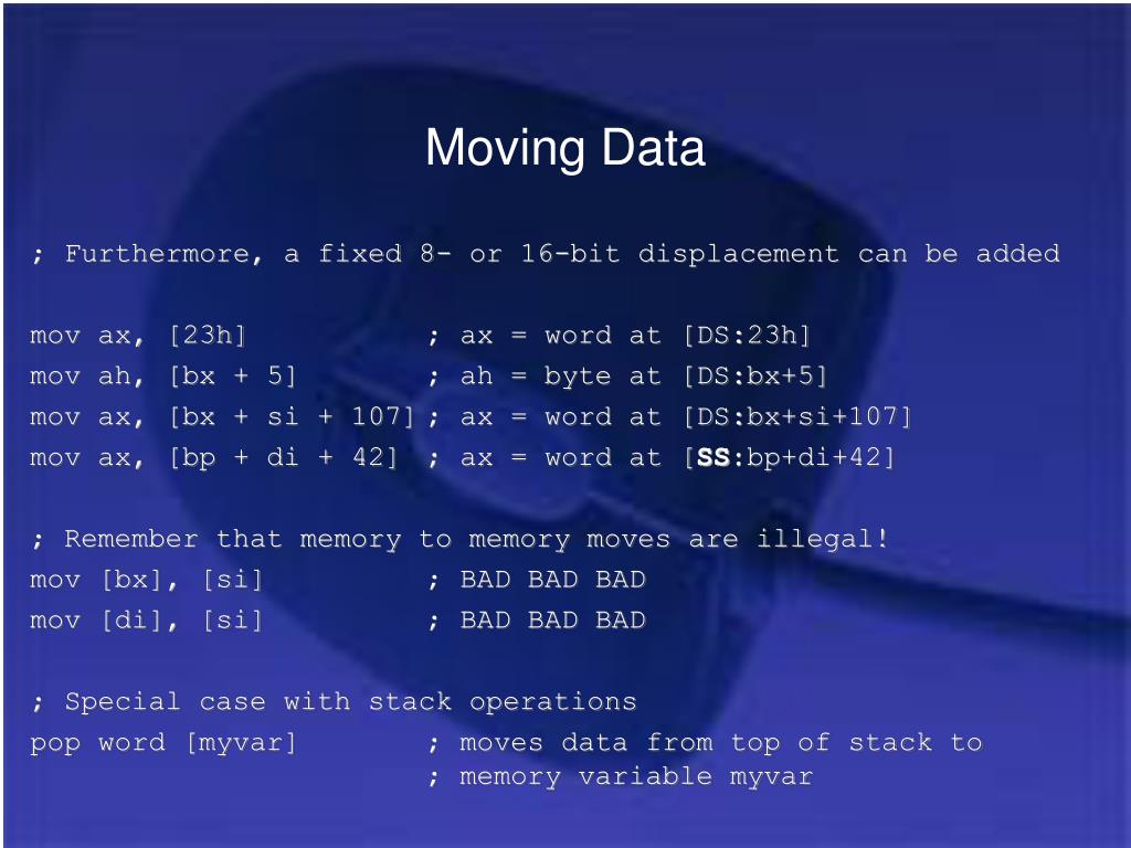 Moving Data ; Furthermore, a fixed 8- or 16-bit displacement can be added mov ax, [23h] ; ax = word at [DS:23h] mov ah, [bx + 5] ; ah = byte at [DS:bx+5] mov ax, [bx + si + 107] ; ax = word at [DS:bx+si+107] mov ax, [bp + di + 42] ; ax = word at [SS:bp+di+42] ; Remember that memory to memory moves are illegal! mov [bx], [si] ; BAD BAD BAD mov [di], [si] ; BAD BAD BAD ; Special case with stack operations pop word [myvar] ; moves data from top of stack to ; memory variable myvar