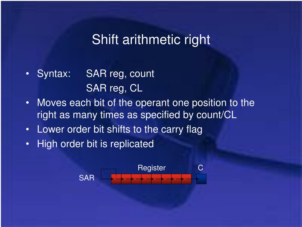 Shift arithmetic right • Syntax: SAR reg, count SAR reg, CL • Moves each bit of the operant one position to the right as many times as specified by count/CL • Lower order bit shifts to the carry flag • High order bit is replicated Register C SAR