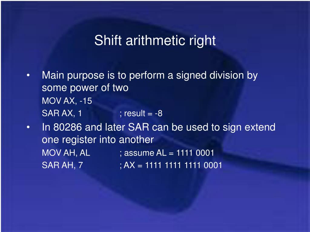 Shift arithmetic right • Main purpose is to perform a signed division by some power of two MOV AX, -15 SAR AX, 1 ; result = -8 • In 80286 and later SAR can be used to sign extend one register into another MOV AH, AL ; assume AL = 1111 0001 SAR AH, 7 ; AX = 1111 1111 1111 0001