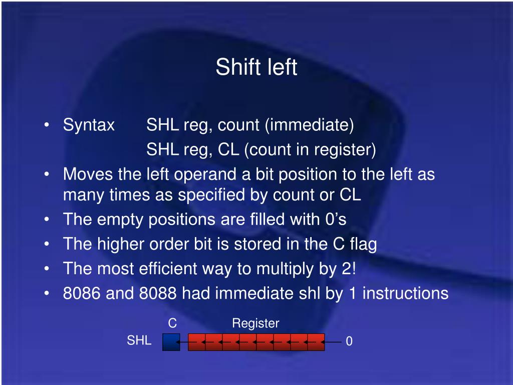 Shift left • Syntax SHL reg, count (immediate) SHL reg, CL (count in register) • Moves the left operand a bit position to the left as many times as specified by count or CL • The empty positions are filled with 0’s • The higher order bit is stored in the C flag • The most efficient way to multiply by 2! • 8086 and 8088 had immediate shl by 1 instructions C Register SHL 0