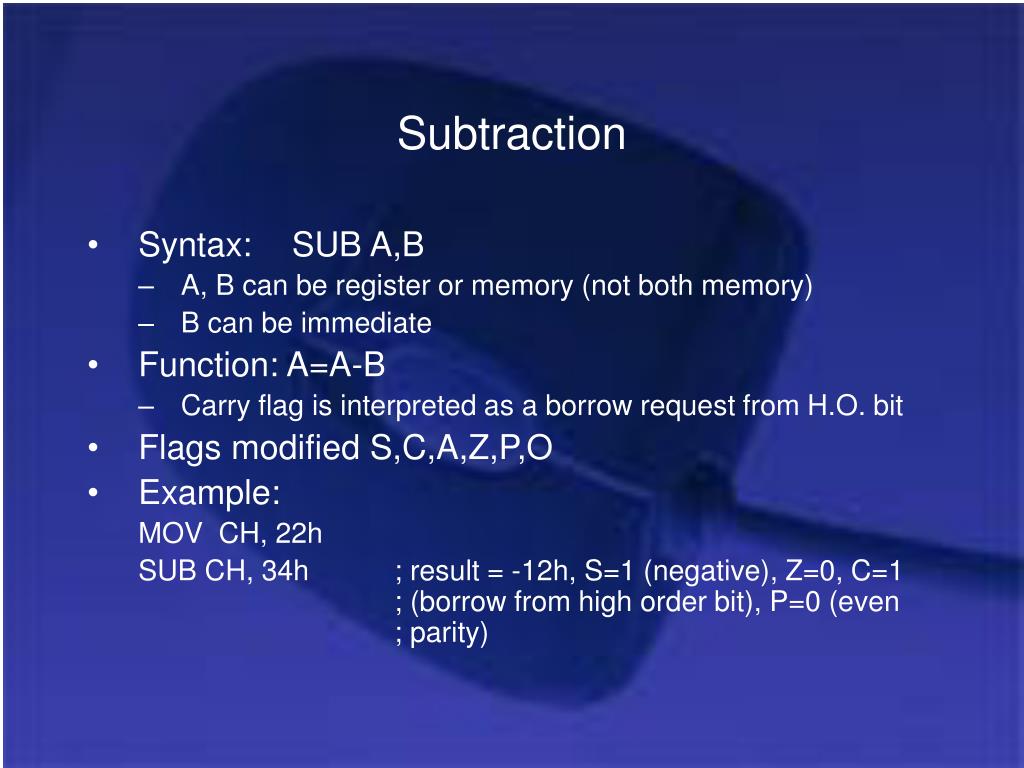 Subtraction • Syntax: SUB A,B • A, B can be register or memory (not both memory) • B can be immediate • Function: A=A-B • Carry flag is interpreted as a borrow request from H.O. bit • Flags modified S,C,A,Z,P,O • Example: MOV CH, 22h SUB CH, 34h ; result = -12h, S=1 (negative), Z=0, C=1 ; (borrow from high order bit), P=0 (even ; parity)